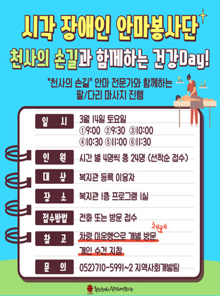 (울산동구장애인복지관) 시각장애인 안마봉사단 천사의 손길(3월) 참여자 모집