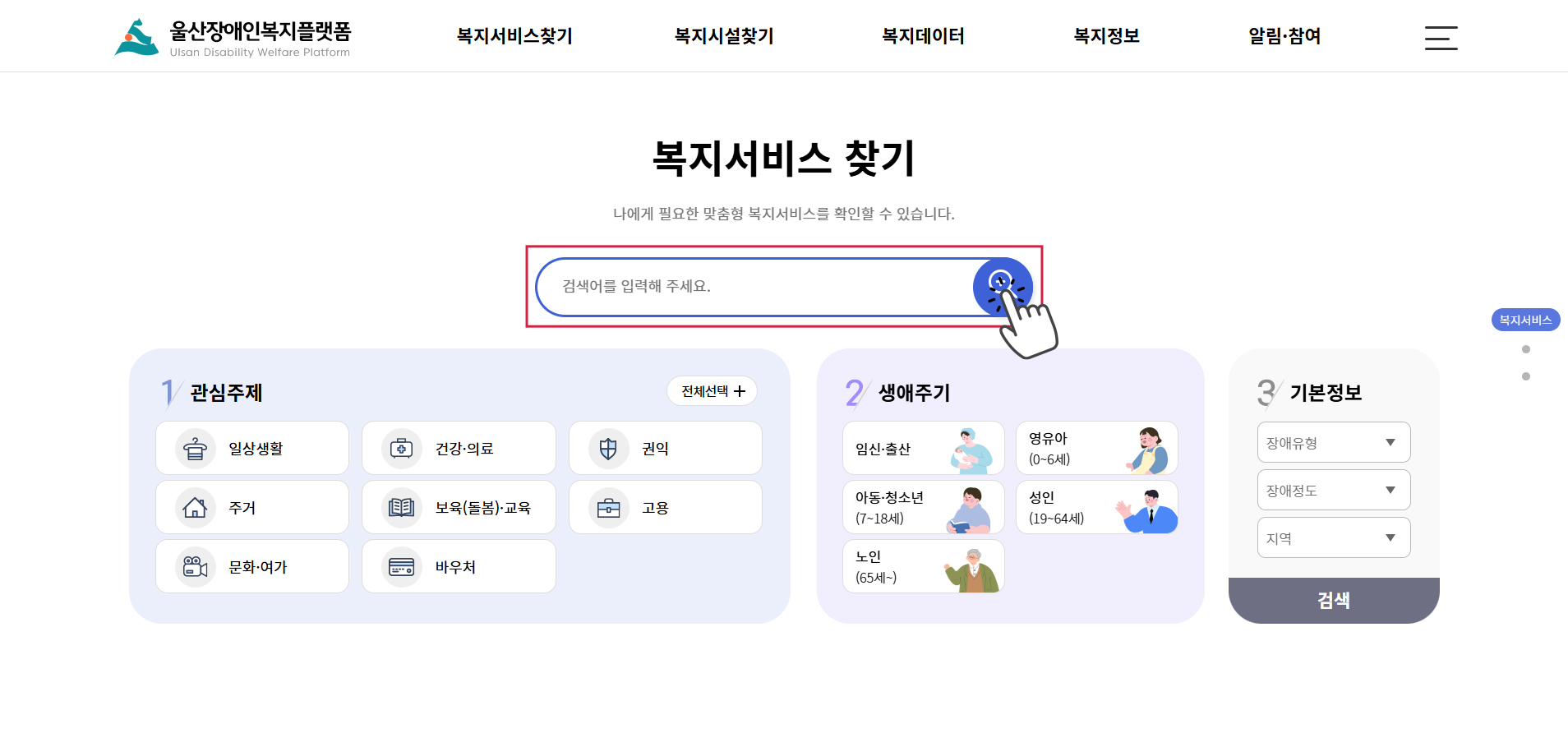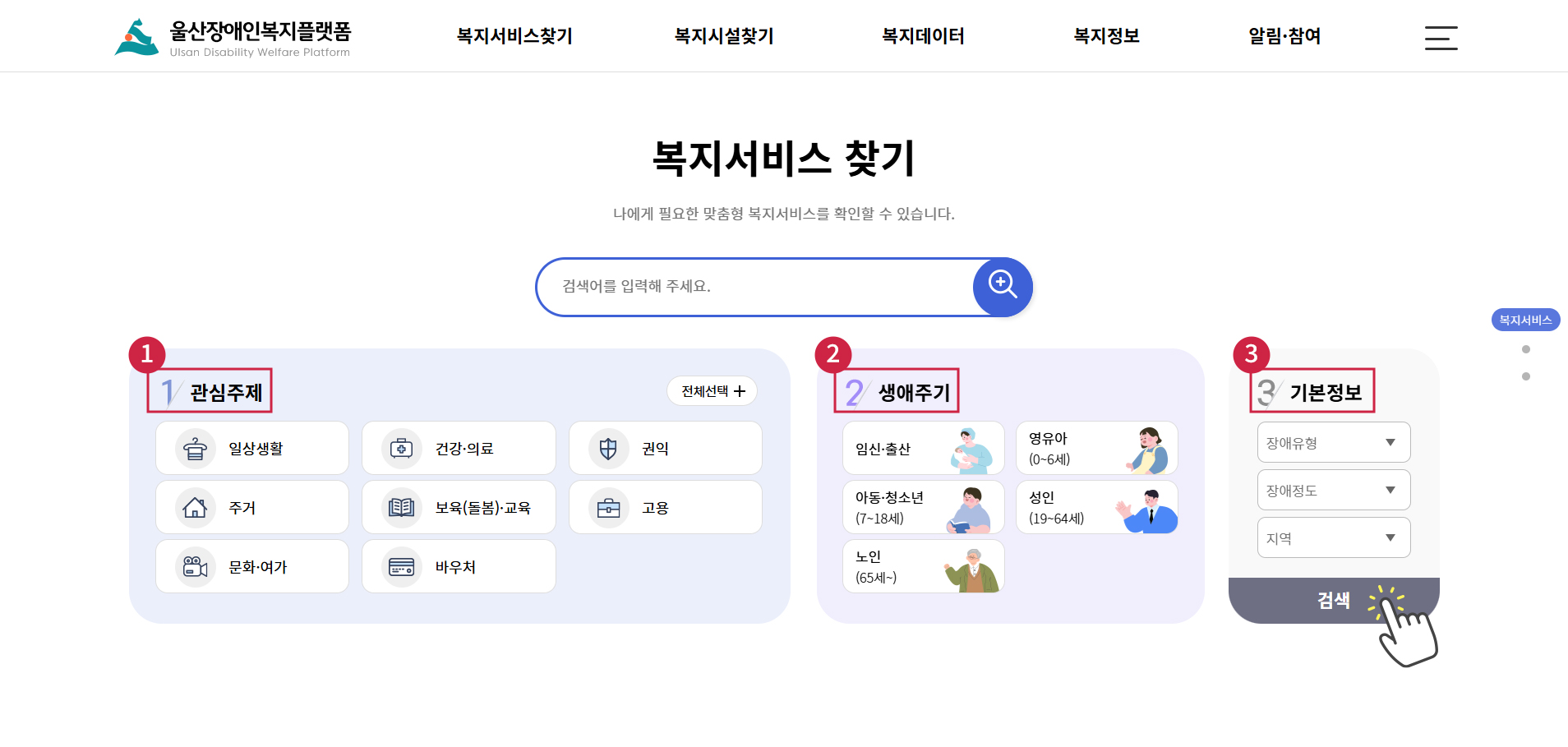 메인화면의 ‘복지서비스 찾기’ 영역에서